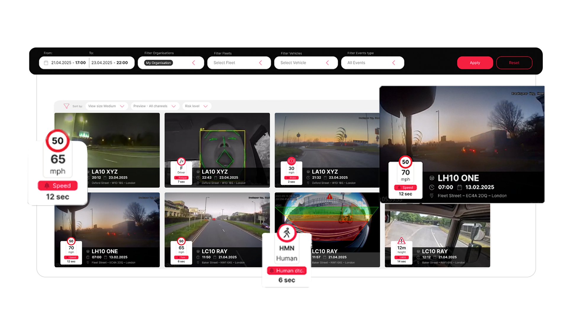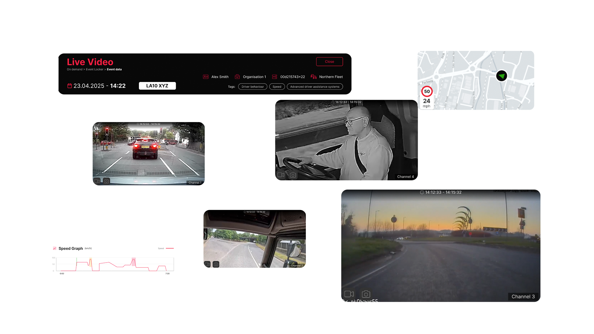 Jump into a live stream from any vehicle, allowing the fleet manager to quickly and easily assess any situation. With up to 12 live cameras, this can be configured for all needs.